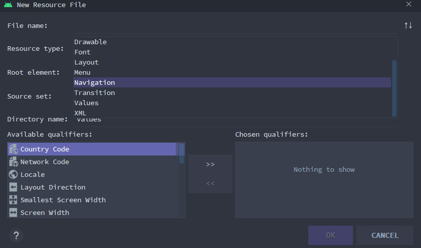 아무튼.. res의 Android Resource File 생성에서 Resource Type을 Navigation으로 만들면 내비게이션을 만들 수 있음